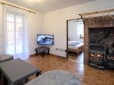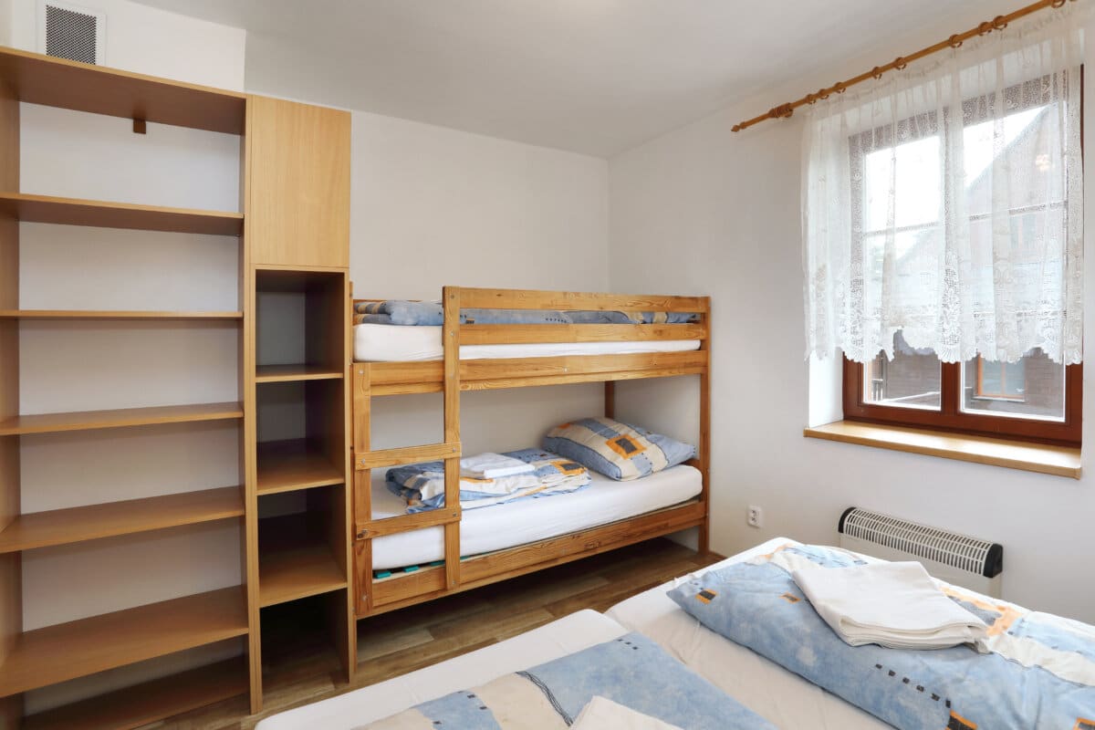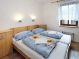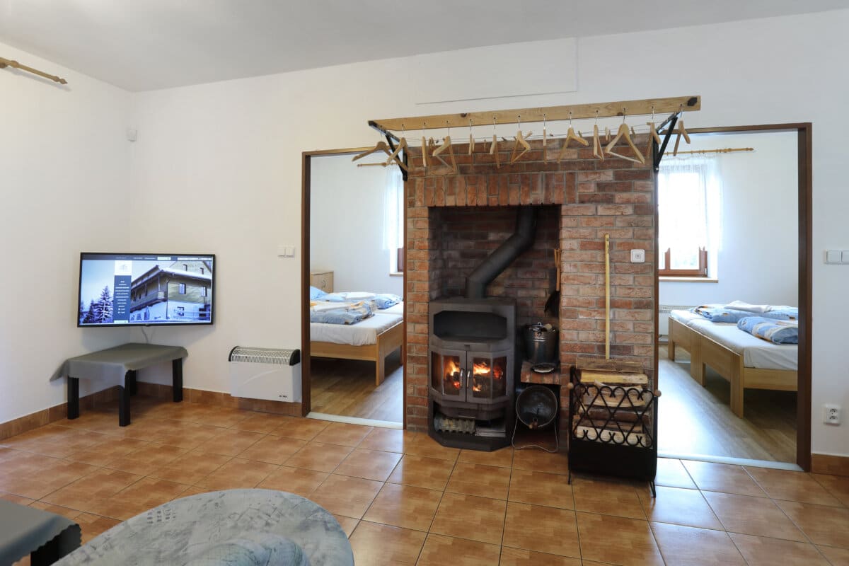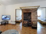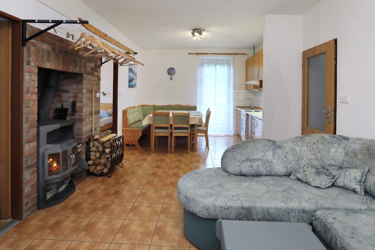 Apartmán tvoří dvě oddělené ložnice (2 a 4 lůžka), obytná místnost s kuchyňským koutem, koupelna se sprchovým koutem a WC a samostatná místnost druhého WC. Celková rozloha apartmánu je 54m2. Kuchyňský kout je osazen plně vybavenou kuchyňskou linkou (lednička, sporák s pečící troubou, rychlovarná konvice, mikrovlnná trouba a základní kuchyňské nádobí) a velkým kuchyňským stolem, rohovou lavicí a židlemi. Pomyslný předěl mezi obývací místností a jídelní částí tvoří dominantní krbová kamna, která vyhřívají nejen tuto velkou místnost, ale pomocí ventilačního systému i obě ložnice a koupelnu. Nad těmito kamny je umístěn prostorný věšák umožňující usušení velkého množství mokrého oblečení. Pro případ, že by někomu činilo potíže v krbových kamnech topit, mají všechny místnosti přímotopné radiátory. V obývací části je televize, satelitní přijímač a velká sedací souprava ve tvaru písmene „U“ s možností rozložení na dvojlůžko. Apartmán má svoji pavlač a vchod přímo na zadní rozlehlou terasu za penzionem.