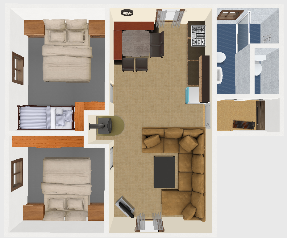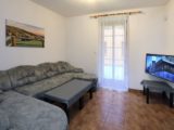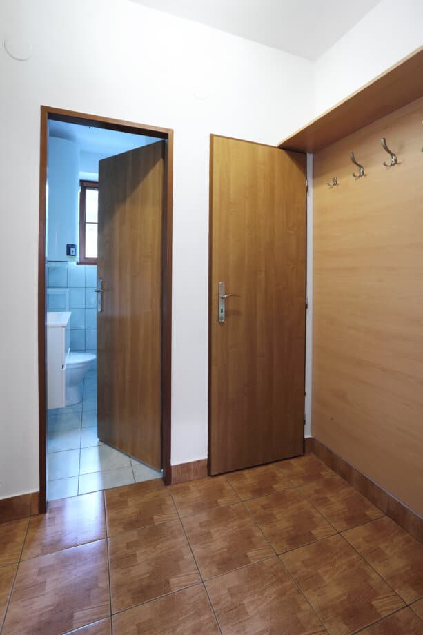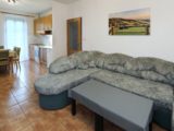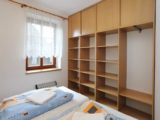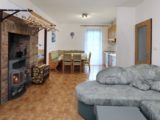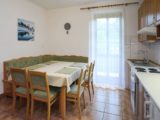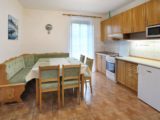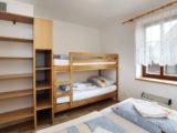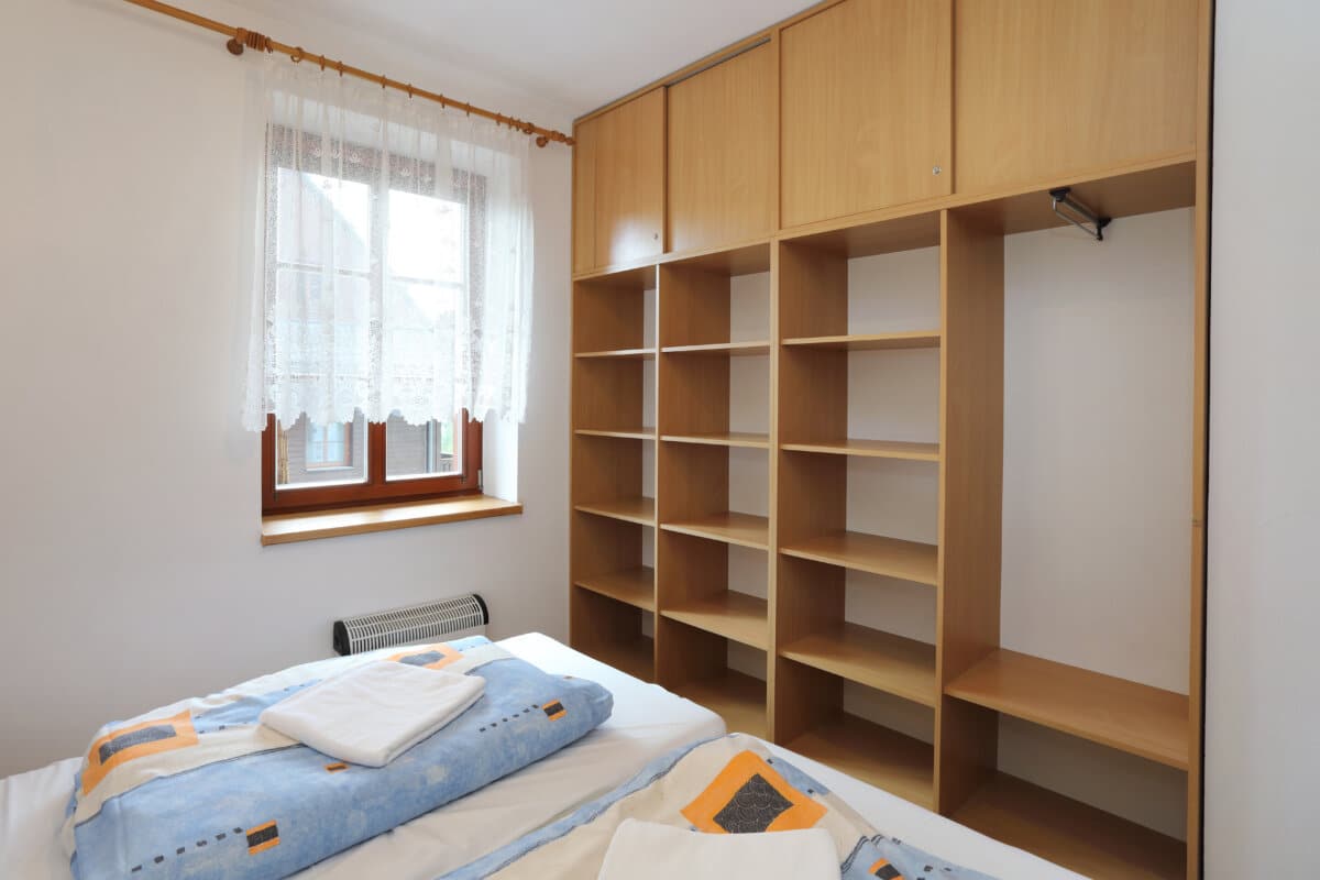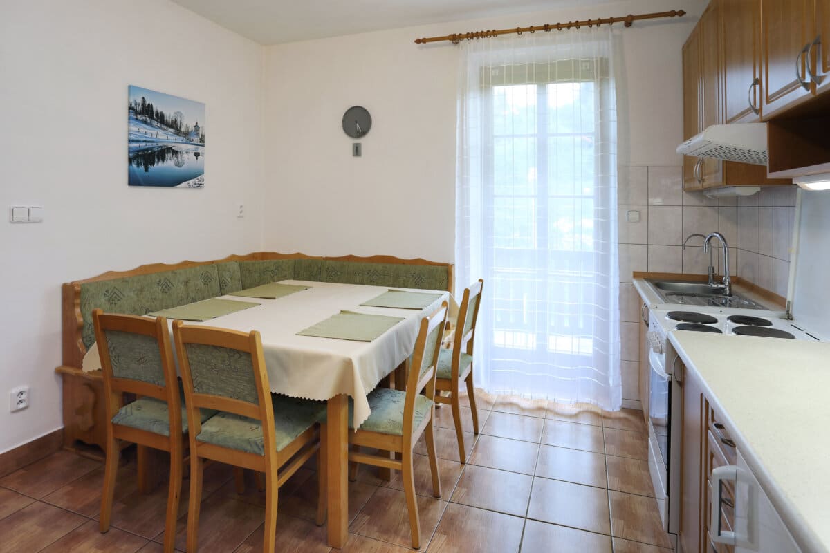 Apartmán tvoří dvě oddělené ložnice (2 a 4 lůžka), obytná místnost s kuchyňským koutem, koupelna se sprchovým koutem a WC a samostatná místnost druhého WC. Celková rozloha apartmánu je 54m2. Kuchyňský kout je osazen plně vybavenou kuchyňskou linkou (lednička, sporák s pečící troubou, rychlovarná konvice, mikrovlnná trouba a základní kuchyňské nádobí) a velkým kuchyňským stolem, rohovou lavicí a židlemi. Pomyslný předěl mezi obývací místností a jídelní částí tvoří dominantní krbová kamna, která vyhřívají nejen tuto velkou místnost, ale pomocí ventilačního systému i obě ložnice a koupelnu. Nad těmito kamny je umístěn prostorný věšák umožňující usušení velkého množství mokrého oblečení. Pro případ, že by někomu činilo potíže v krbových kamnech topit, mají všechny místnosti přímotopné radiátory. V obývací části je televize, satelitní přijímač a velká sedací souprava ve tvaru písmene „U“ s možností rozložení na dvojlůžko. Apartmán má svoji pavlač a vchod přímo na zadní rozlehlou terasu za penzionem.